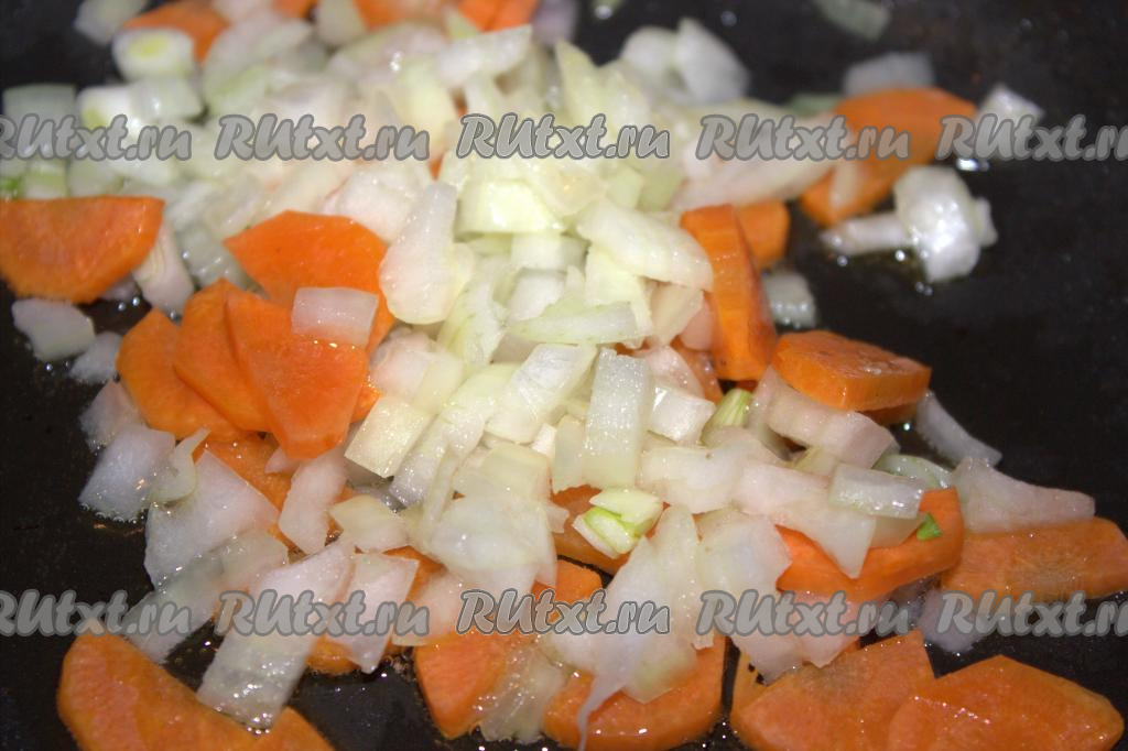В сковороду влить растительное масло, выложить мелко нарезанный лук и нарезанную полукольцами морковь. Обжарить морковку с луком на среднем огне до золотистого цвета лука и мягкости моркови, периодически помешивая.