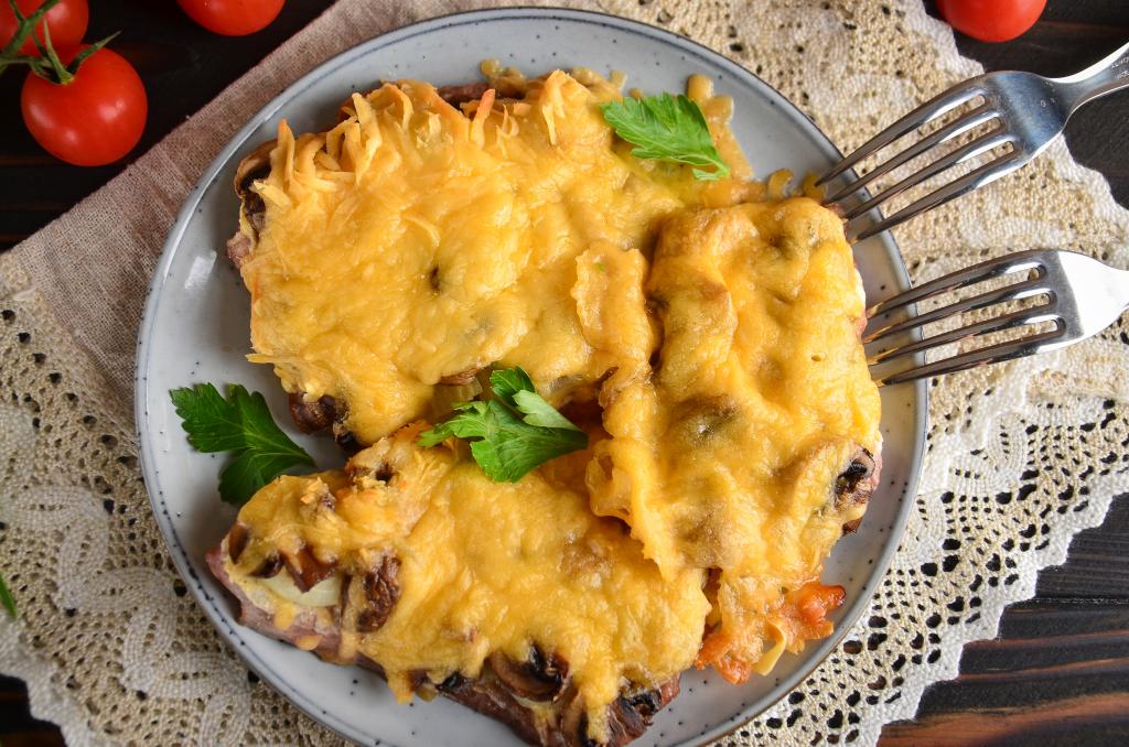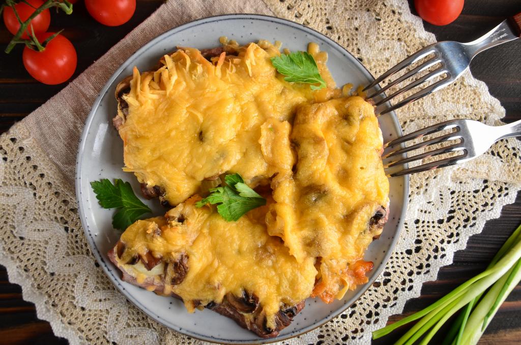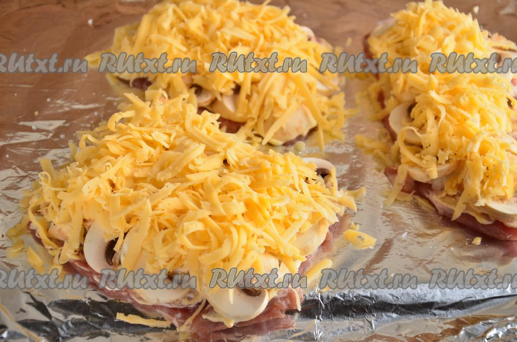 Твёрдый сыр, который хорошо плавится, натрите на крупной тёрке и выложите на отбивные поверх грибов. Поставьте противень в духовку, разогретую до 180 градусов. Спустя 15-20 минут вкусное, сочное мясо с грибами под сырной корочкой будет готово.