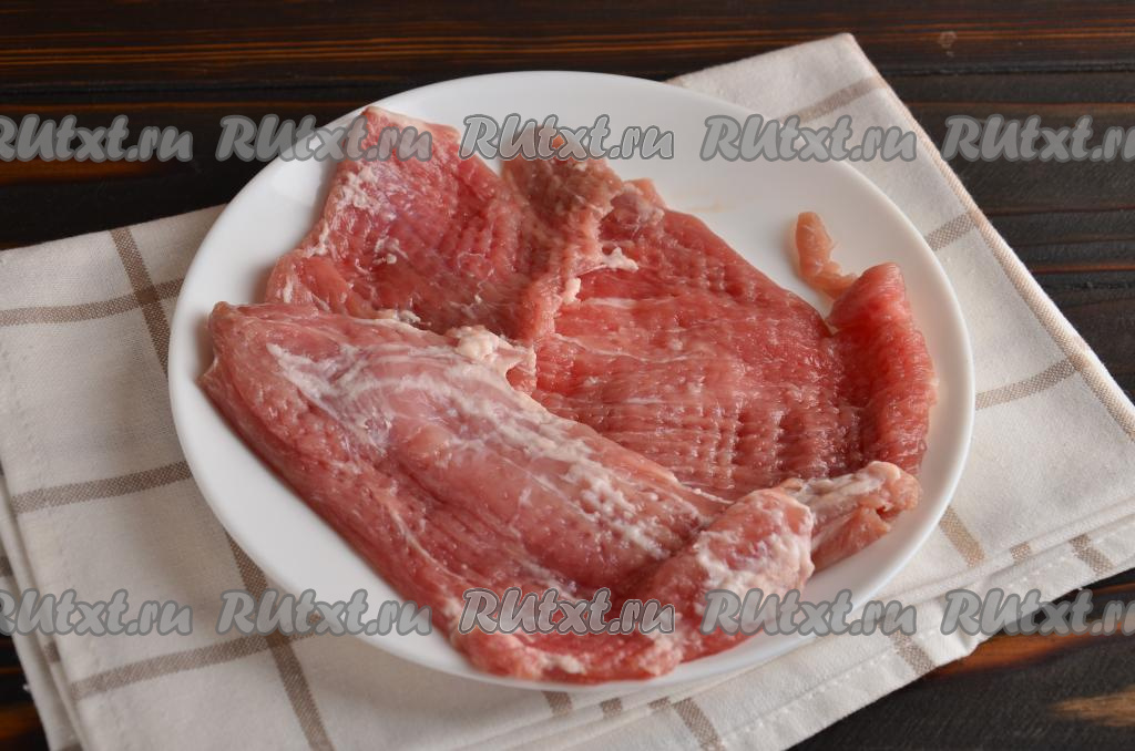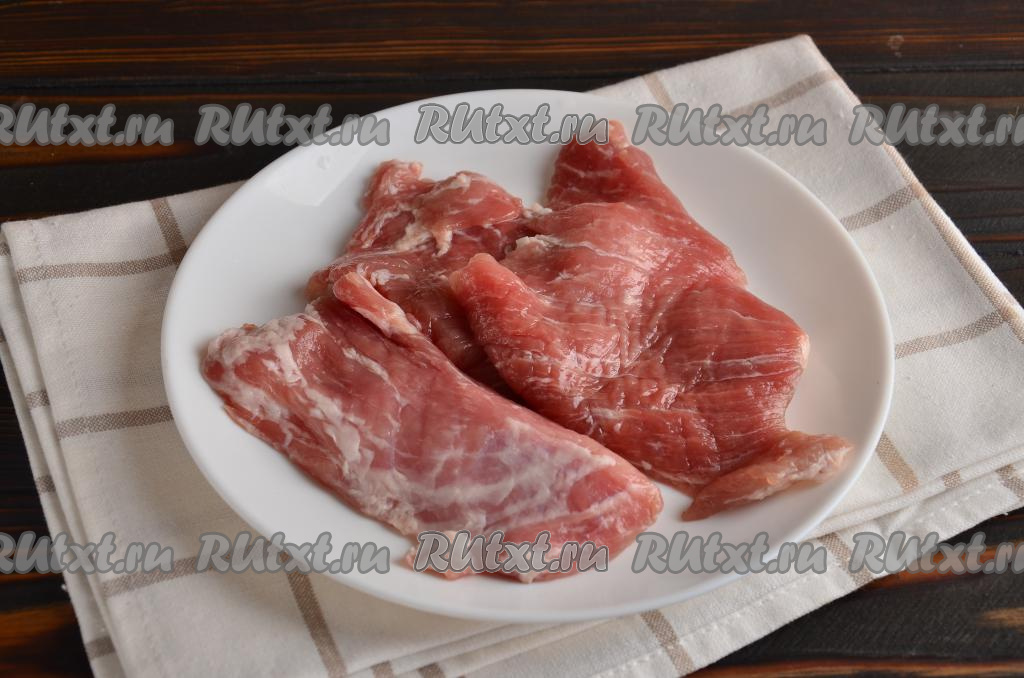 Охлажденную мякоть свинины (у меня свиной ошеек) нужно вымыть, обрезать всё лишнее и нарезать мясо на порционные кусочки.
