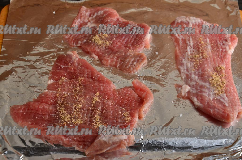 На противень положите фольгу и смажьте её растительным маслом. На застеленный противень выложите свиные отбивные, подсолите их и присыпьте специями по вкусу.