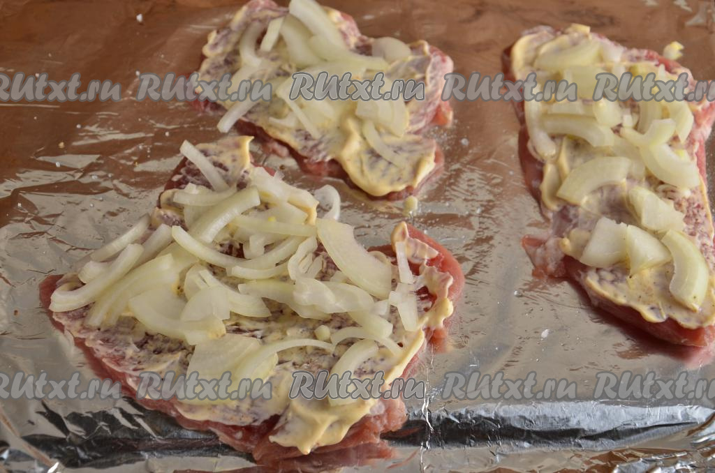 Крупную луковицу очистите и вымойте, нарежьте тонкой соломкой. Выложите лук поверх отбивных.