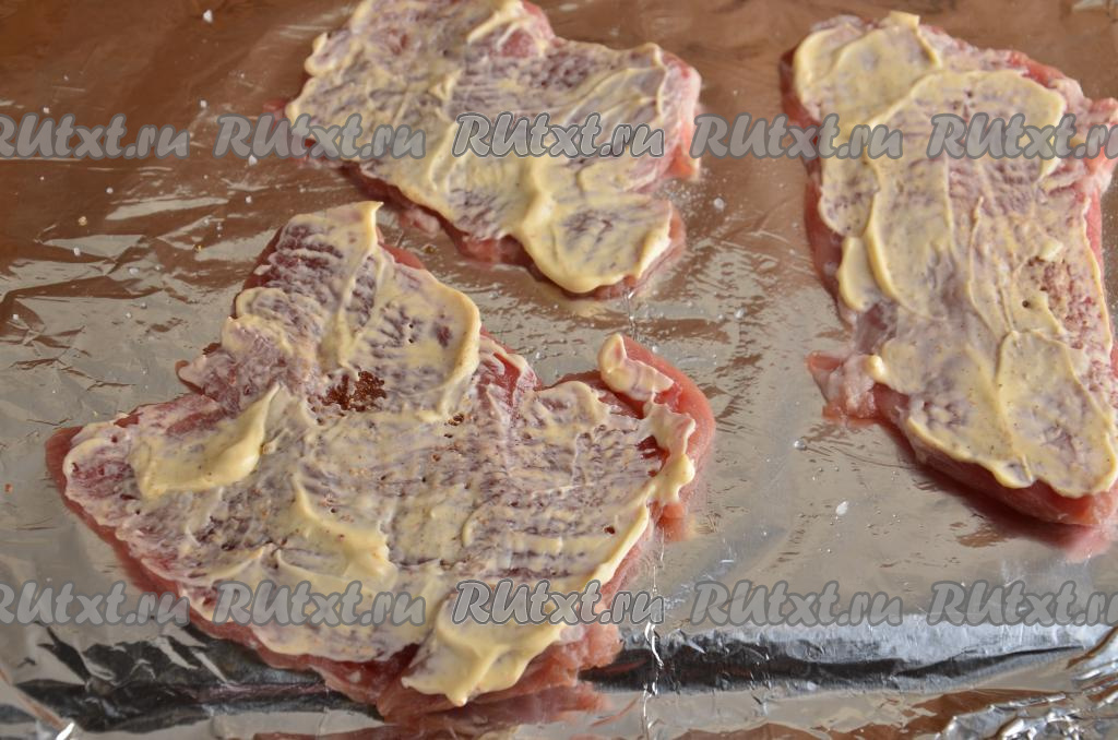 Теперь смажьте кусочки мяса майонезом любой жирности - удобно использовать ложку или кулинарную кисть.