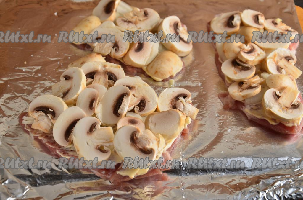 Свежие шампиньоны вымойте и нарежьте тонкими пластинками, выложите их поверх отбивных из свинины. Также можно использовать и замороженные шампиньоны.