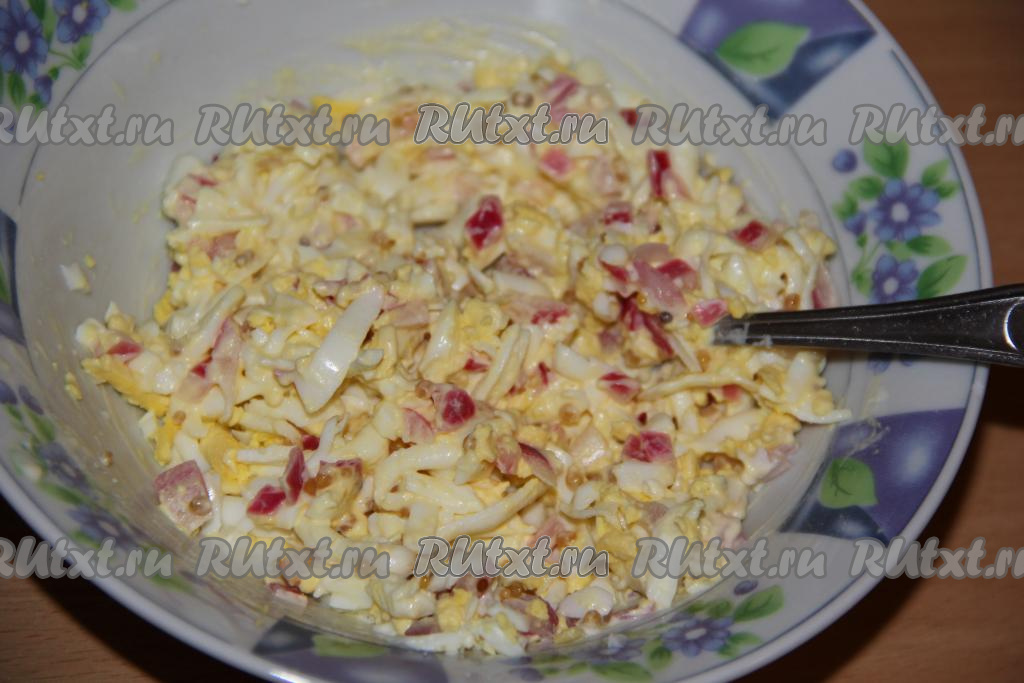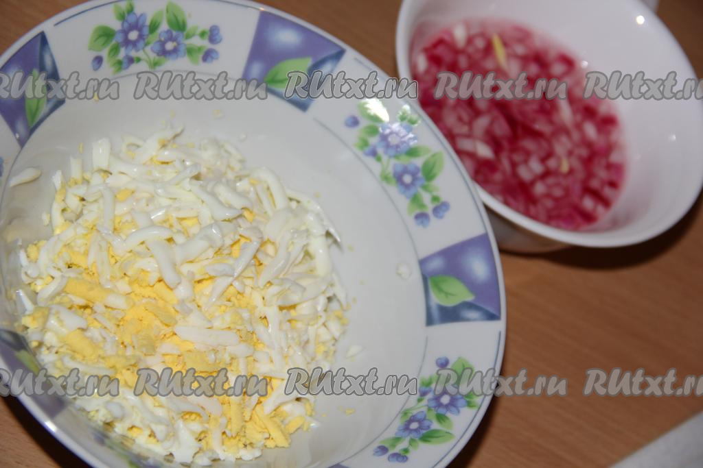 Яйца предварительно сварить вкрутую (в течение минут 10) и остудить. Очистить яйца и натереть на крупной тёрке.