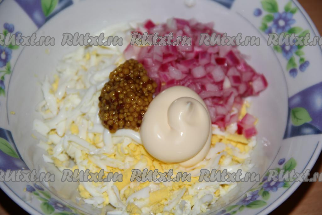 Лук откинуть на дуршлаг и дать стечь маринаду. Лук выложить к натёртым яйцам, добавить майонез и, по желанию, зерновую горчицу.