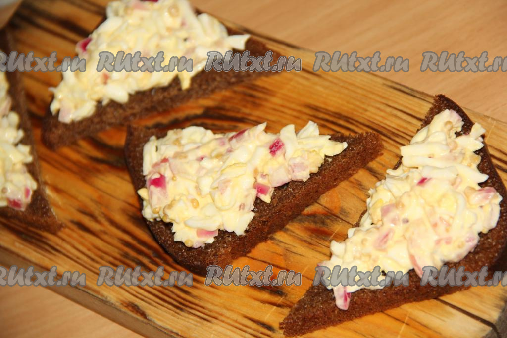 Выложить салат из яиц и маринованного лука на кусочки чёрного хлеба.