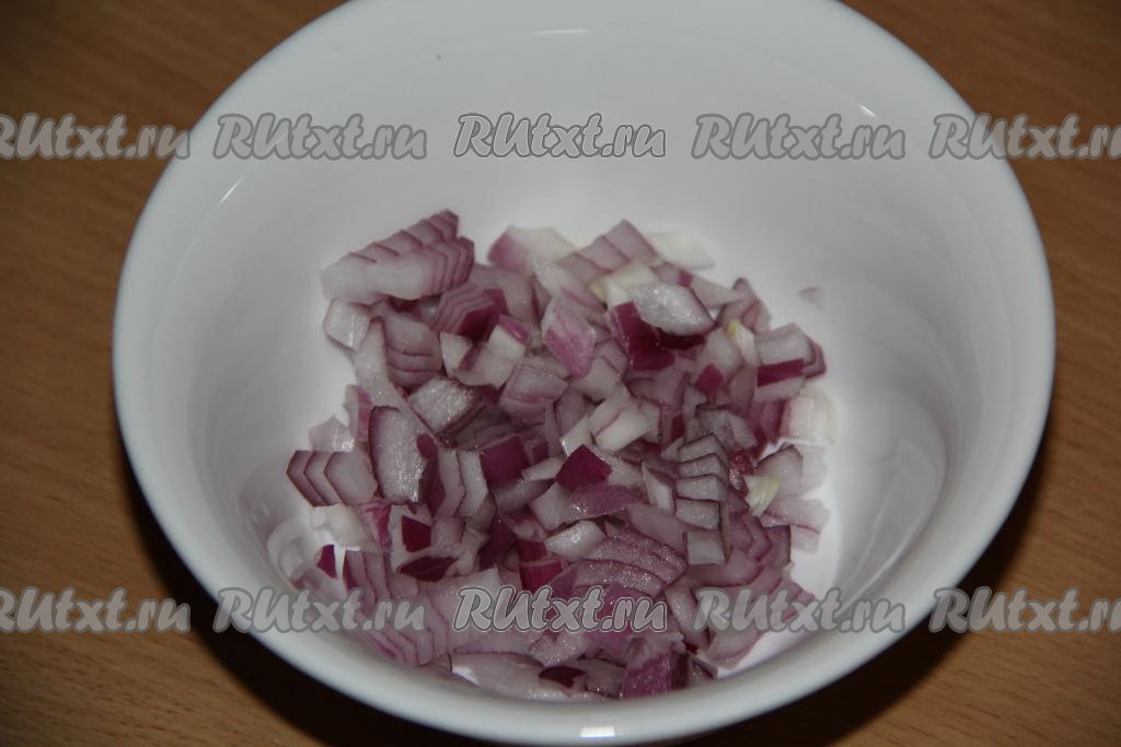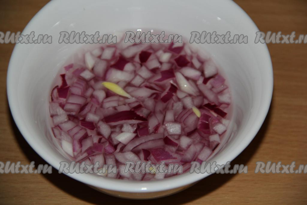 Добавить в миску с луком уксус, воду и сахар. Перемешать и оставить лук мариноваться на 30 минут.