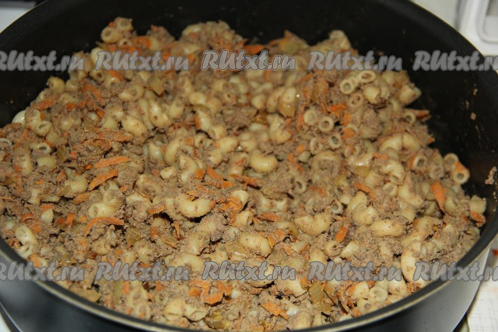 Хорошо перемешать макароны с печенью. Потомить пару минут на небольшом огне, чтобы макароны полностью прогрелись.