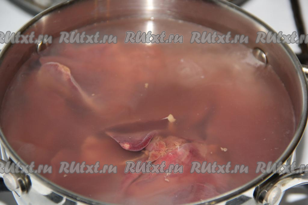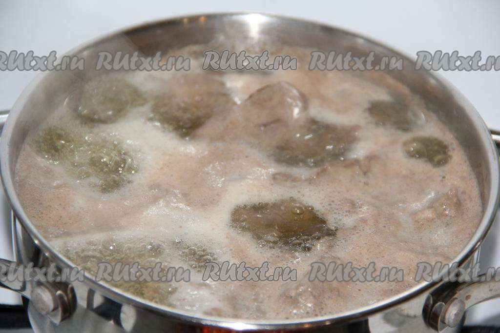 Кастрюлю с куриной печенью поставить на огонь, дать воде закипеть, а затем варить печёнку на небольшом огне в течение 10 минут.