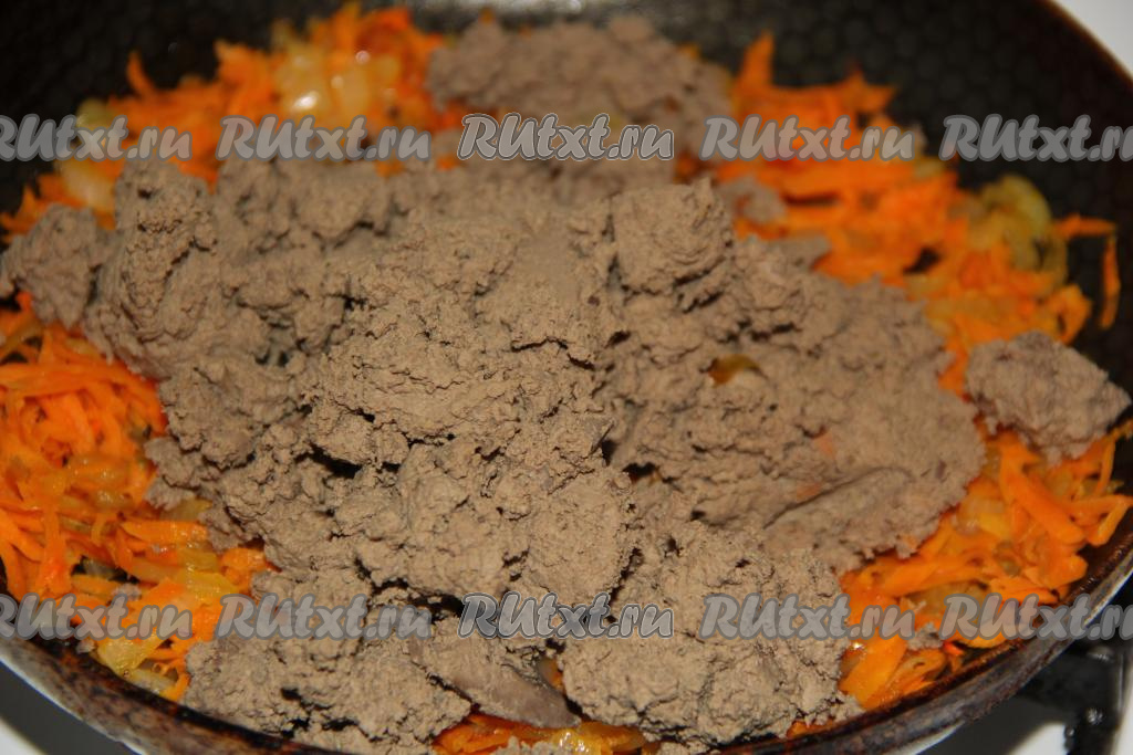 Измельчённую печень выложить в сковороду к обжаренным овощам.