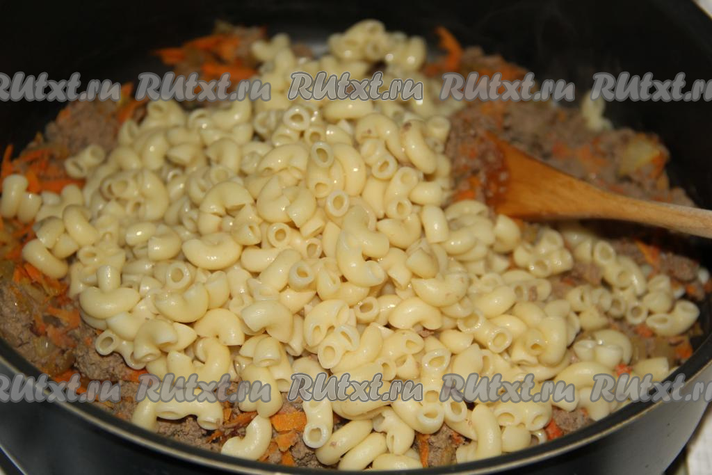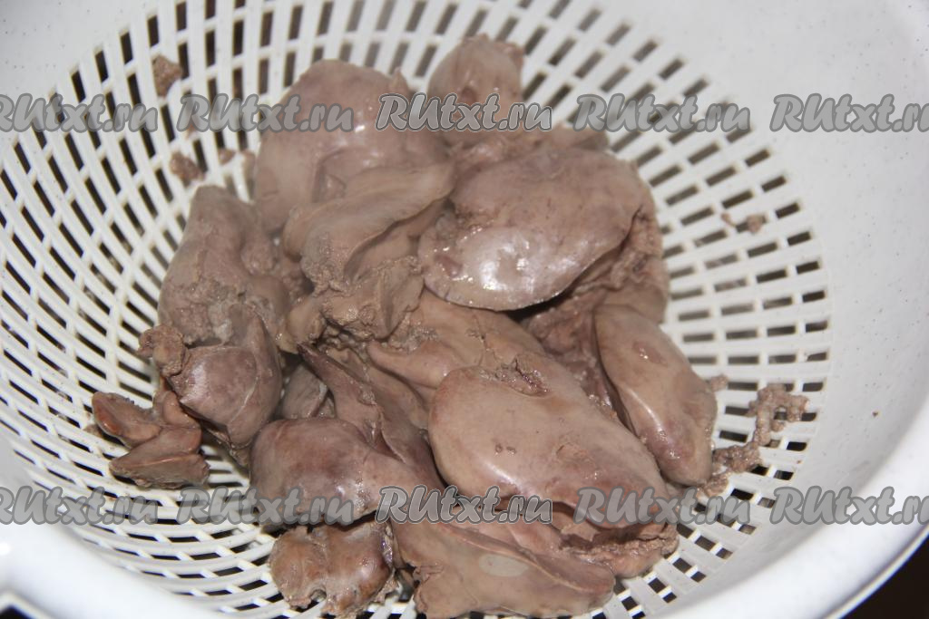 Макароны предварительно сварить до готовности, а затем промыть и, откинув на дуршлаг, дать стечь воде (можно использовать макароны, оставшиеся от обеда или ужина). Добавить макароны в сковороду к куриной печени с овощами.