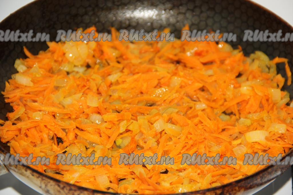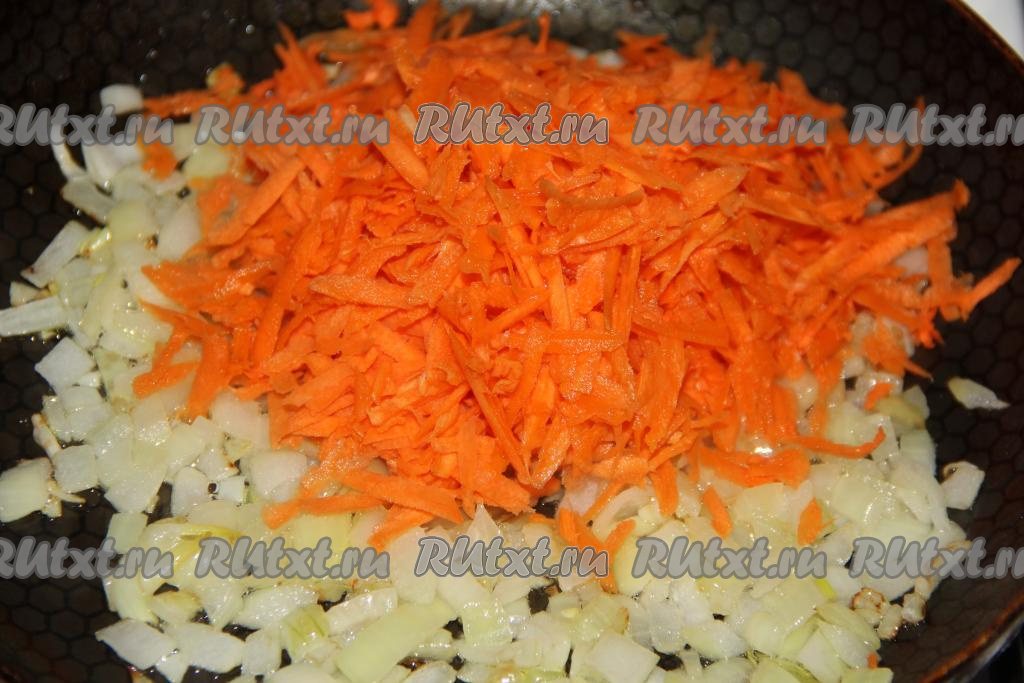 Обжарить на среднем огне лук в течение 3 минут, периодически перемешивая, затем добавить морковку, предварительно натёртую на крупной тёрке.