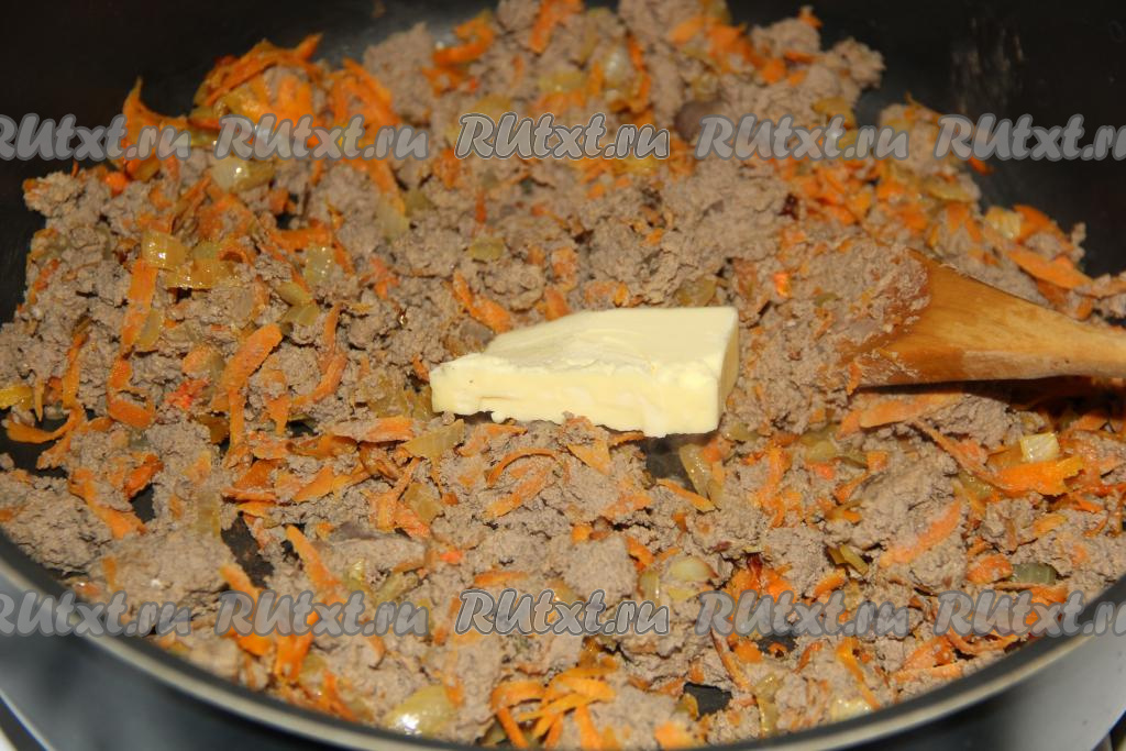 Перемешать печёнку с морковкой и луком, всыпать специи и соль, снова перемешать. Добавить кусочек сливочного масла и ещё раз перемешать.
