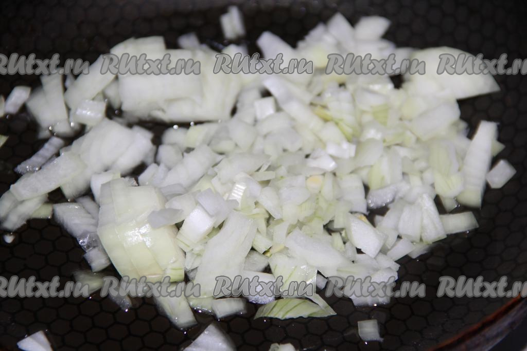 Очистить морковку и лук. В сковороду влить растительное масло, выложить мелко нарезанный лук.