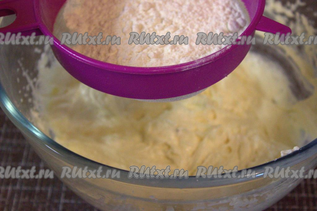 В получившуюся массу всыпать небольшими порциями муку, просеянную с разрыхлителем. Тесто вначале перемешивать ложкой, а затем замешивать руками.