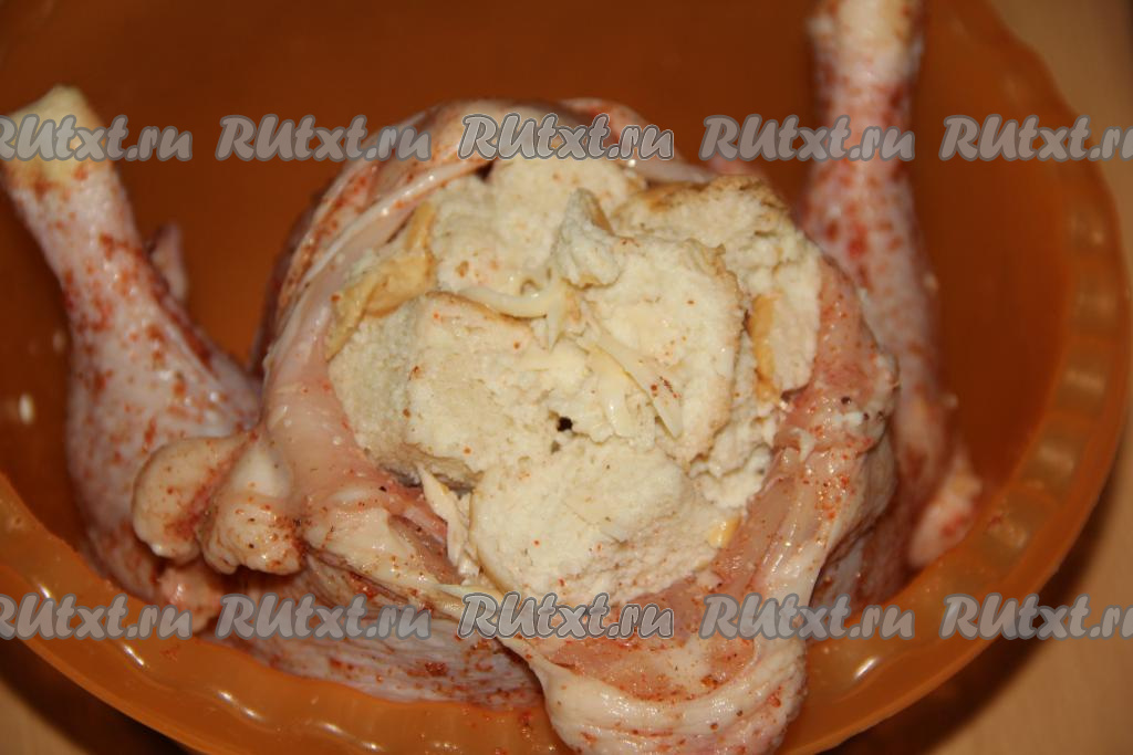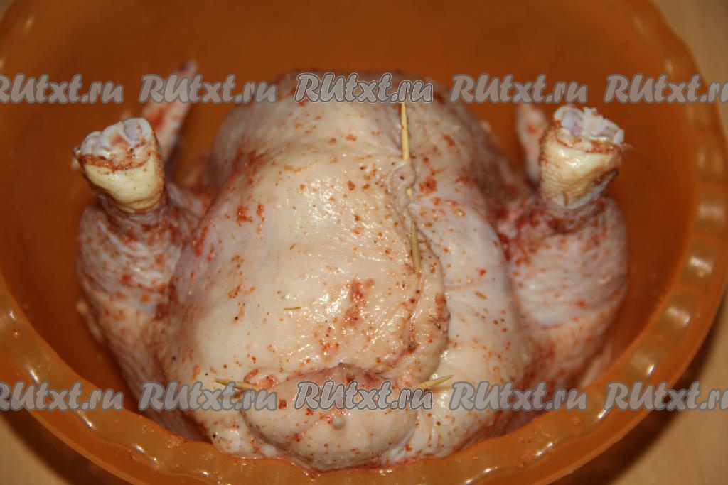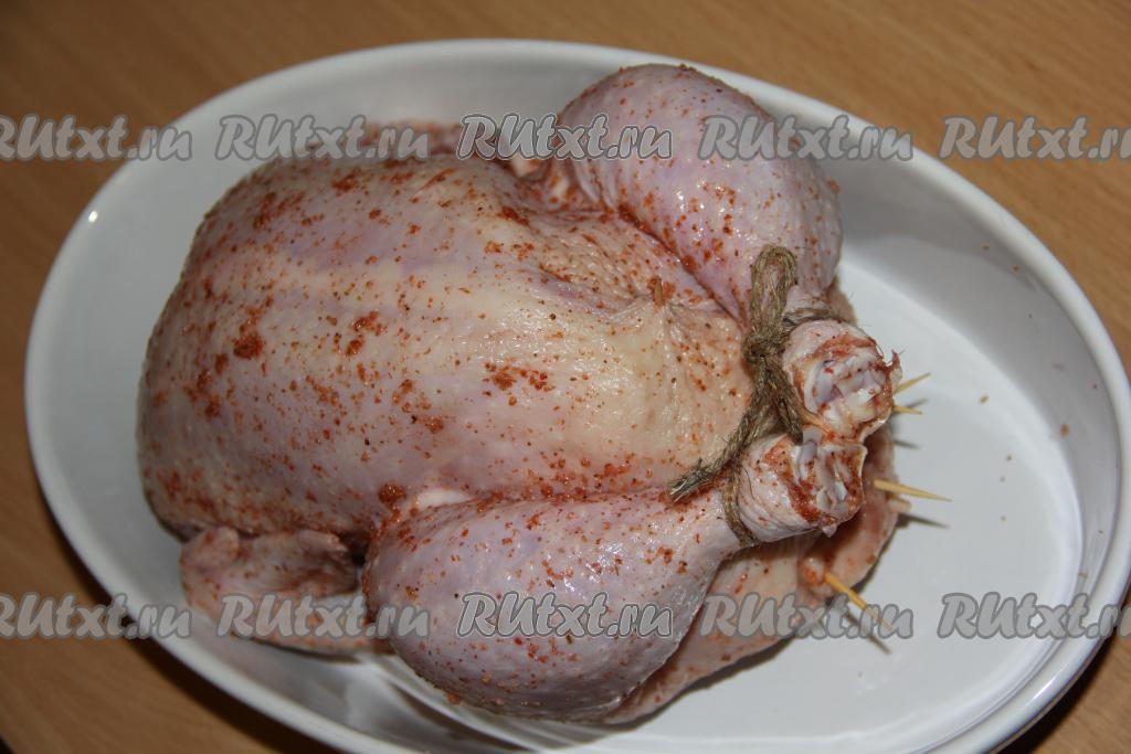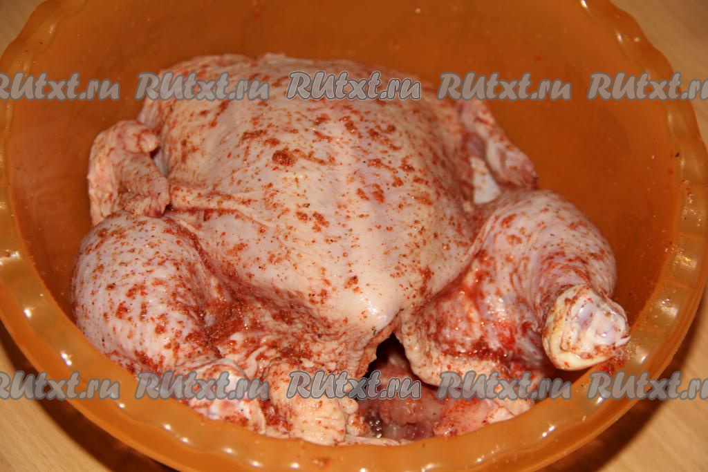 Курицу промыть под водой, обсушить полотенцем, а затем натереть солью и специями внутри и снаружи.