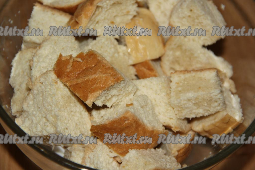 Белый хлеб (или батон) нарезать или поломать на крупные кусочки. Залить хлеб молоком и оставить минут на 10. По прошествии времени лишнее молоко слить, кусочки хлеба слегка отжать от жидкости.