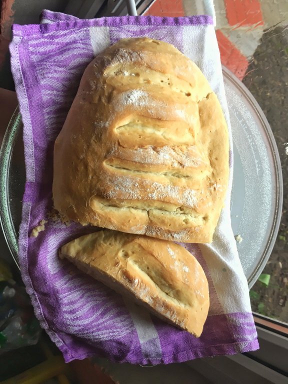 Достаём наш румяный батон из духовки и даём ему отлежаться до остывания, накрыв свежую выпечку полотенцем. Батон, приготовленный в домашних условиях, получается невероятно нежным, мягким, вкусным, при разрезании не крошится, у него однородная и мелкопористая текстура мякиша.