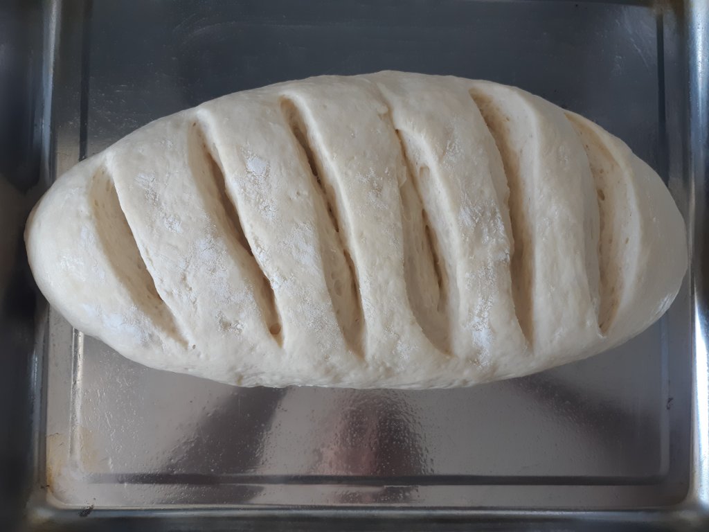 Затем острым ножом делаем надрезы на поверхности батона и оставляем на расстойку, примерно, на 30-40 минут, накрыв сверху плёнкой (или полотенцем).
