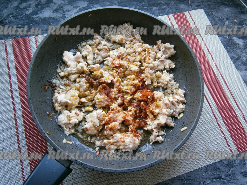 Добавить к луку фарш, посолить его, всыпать паприку, специи для фарша, любые сушёные травы.