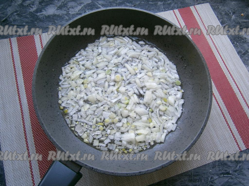Лук очистить, а затем нарезать помельче и обжарить его на растительном масле до золотистости на среднем огне, периодически помешивая.