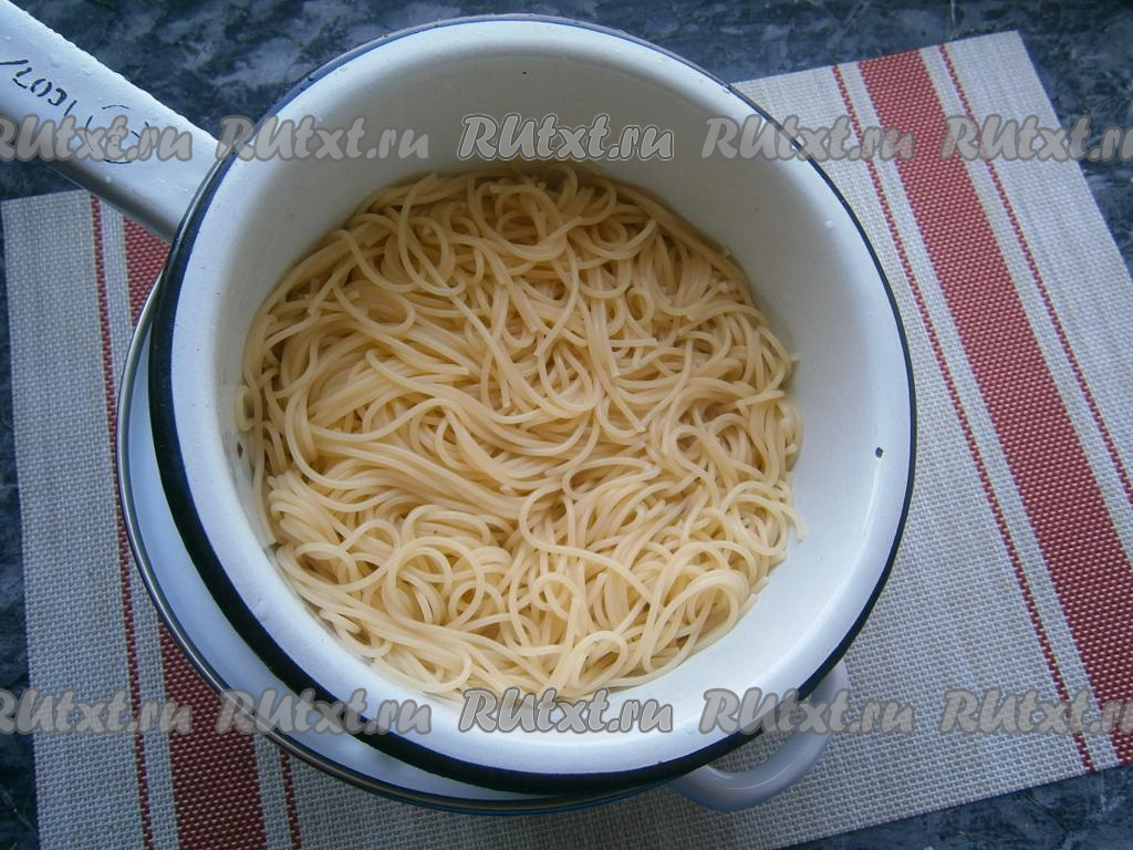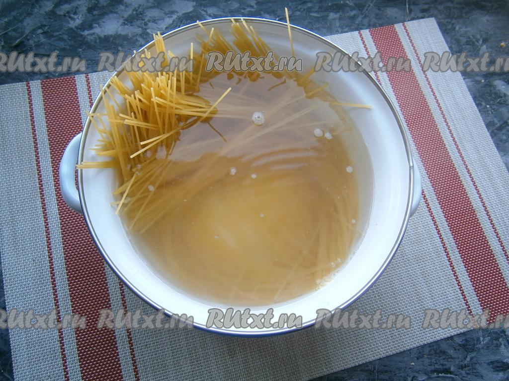 Спагетти отварить в подсоленной воде, согласно инструкции на упаковке.