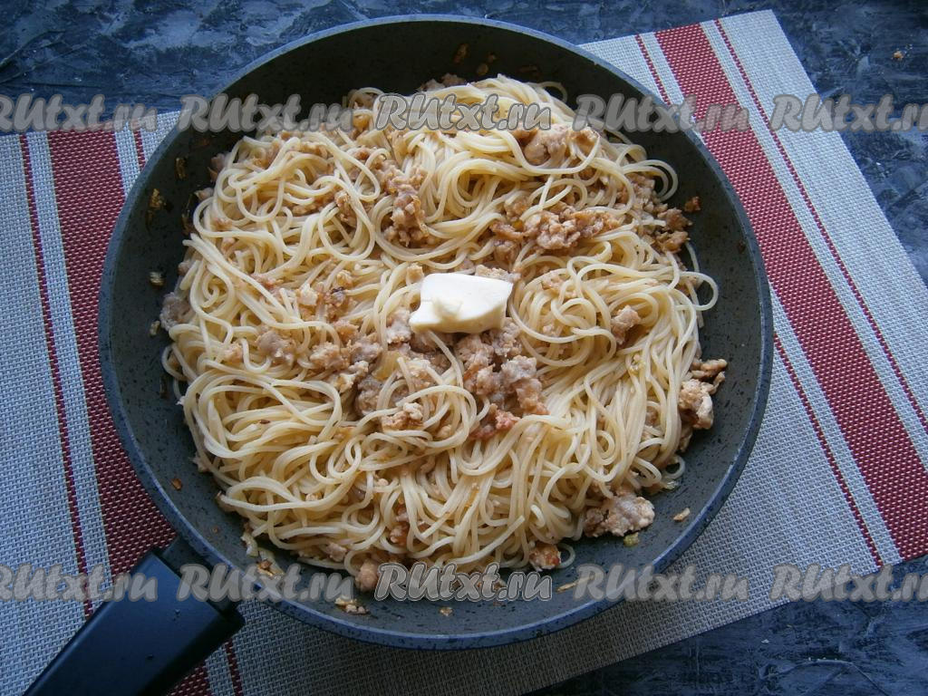 Далее добавить к фаршу отваренные спагетти, кусочек сливочного масла, перемешать и прогреть на небольшом огне минуты 2-3.