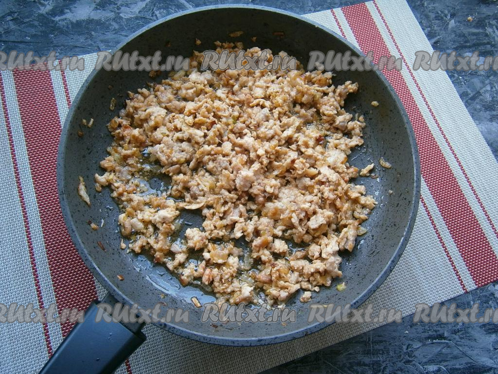 И обжарить фарш с луком в течение 7-10 минут на среднем огне, периодически разбивая комочки мяса и перемешивая.