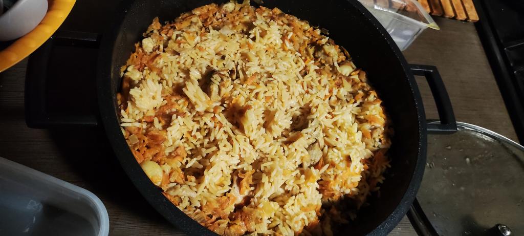 Накрываем сковороду крышкой и уменьшаем огонь до самого минимума. Томим плов из пропаренного риса с курицей 30 минут, не открывая крышку (!), на самом маленьком огне.