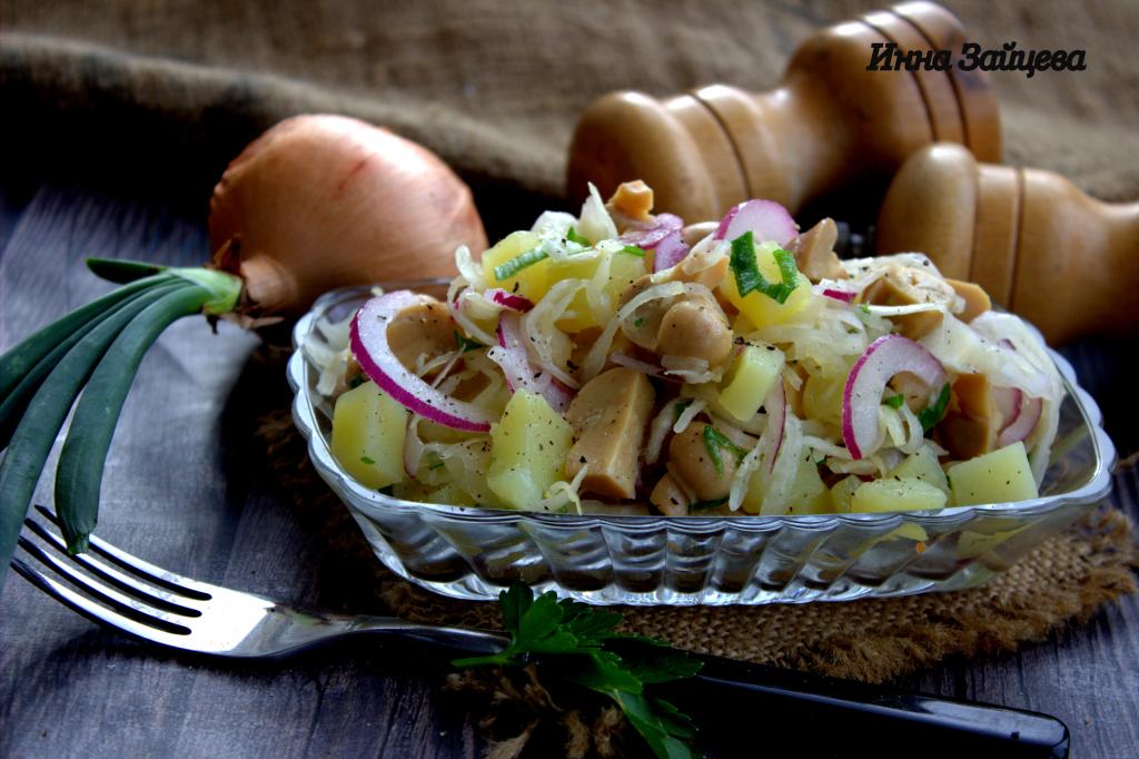 Сегодня хочу предложить довольно простой в приготовлении, но в тоже время очень вкусный салат с квашеной капустой, картошкой и маринованными грибами. Благодаря отварному картофелю, этот постный салатик получается сытным и вполне может стать самостоятельным блюдом. А квашеная капуста и маринованные грибочки придают салату особую пикантность. Надеюсь, что вам и вашим родным блюдо придётся по вкусу. Попробуйте!