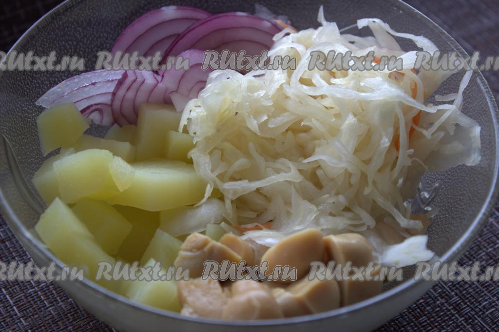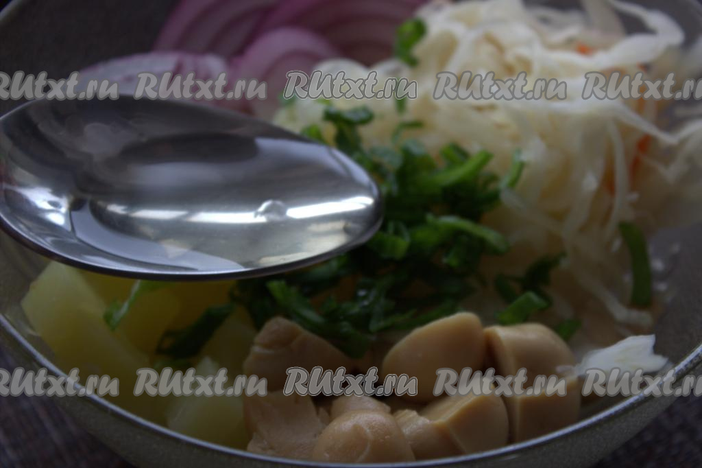 В миске соединить картошку, лук и грибы, выложить квашеную капусту, по желанию, можно добавить мелко нарезанный зелёный лук.