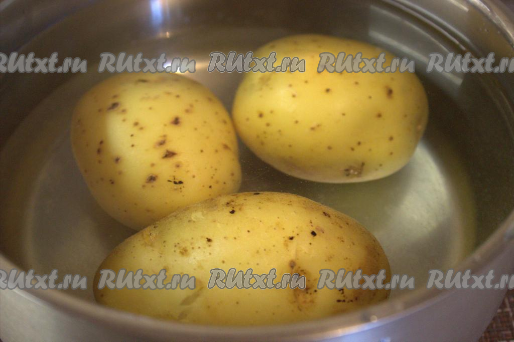 Картофель тщательно вымыть и, не очищая от кожуры, поместить в кастрюлю, полностью залить клубни холодной водой, накрыть крышкой и поставить на огонь. Варить картофелины после закипания воды на медленном огне до готовности (20-25 минут). Готовые клубни будут легко прокалываться ножом (или вилкой). Затем слить воду и дать картошке остыть.