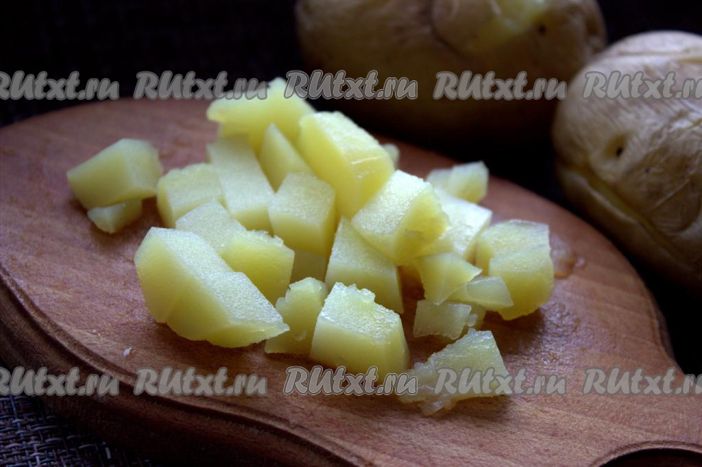 Остывший картофель почистить и нарезать на кубики среднего размера.