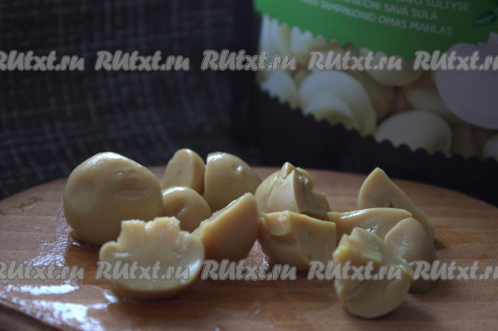 Крупные маринованные грибы разрезать на несколько частей (слишком мелко резать не нужно). Например, крупные маринованные грибы можно разрезать на 4-6 частей.