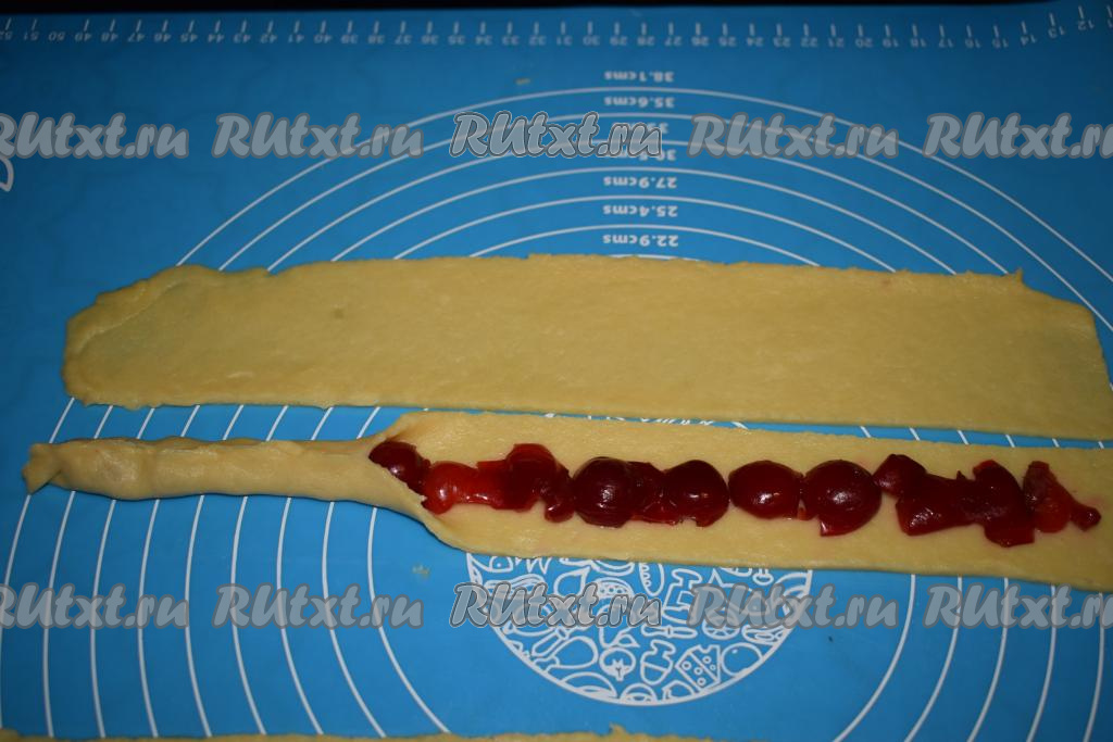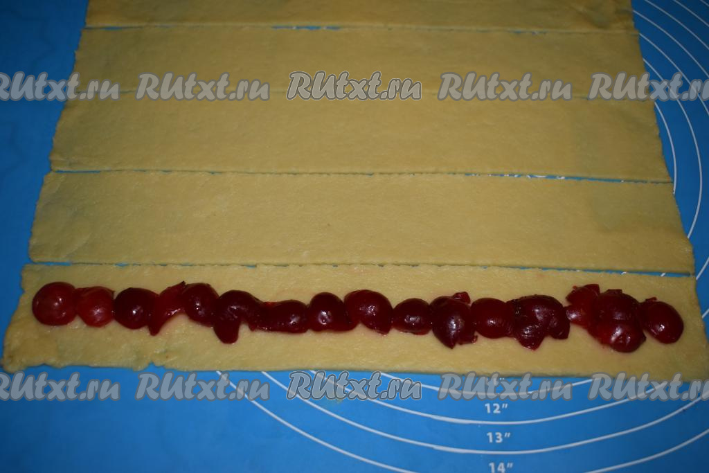 Нарезаем каждый пласт на 5 полос шириной 5 см. Далее на каждую полосу теста выкладываем вишни, как на фото.
