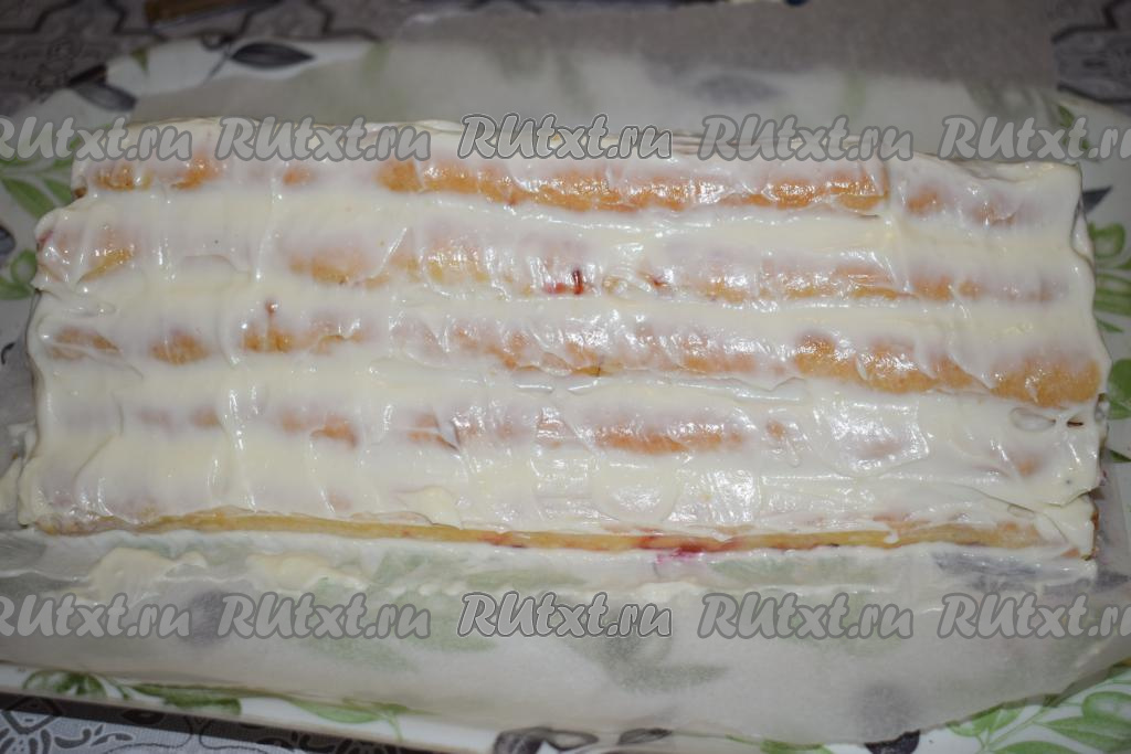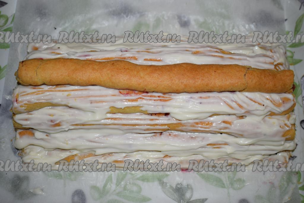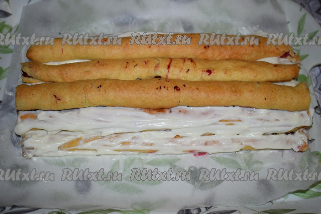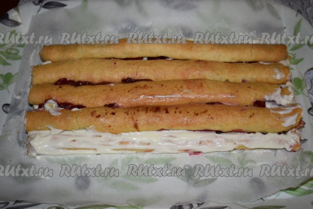 Сверху выкладываем 4 трубочки, их также обильно смазываем кремом.