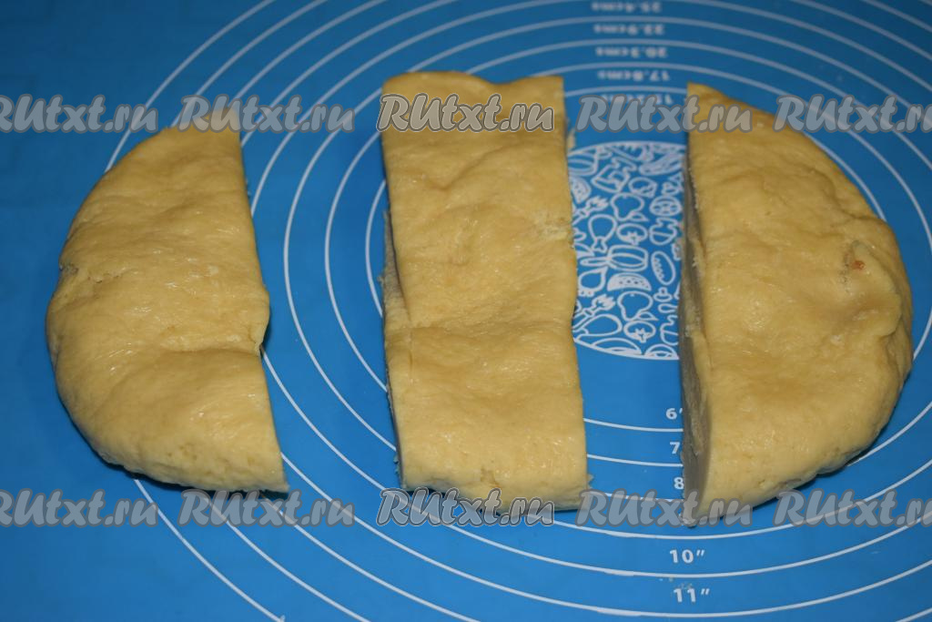 Достаём из морозилки охлаждённое тесто и разделяем его на 3, примерно, равные части.