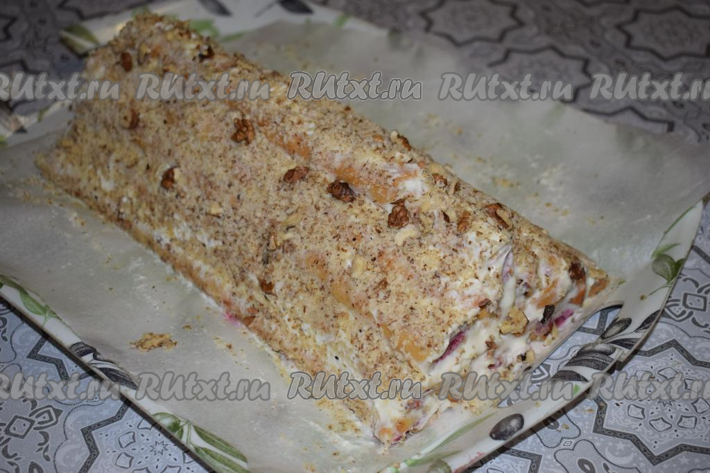 Сверху нашу избушку посыпаем измельчёнными грецкими орехами (или натёртым на тёрке шоколадом). Накрываем торт плёнкой и отправляем в холодильник на 8-10 часов.