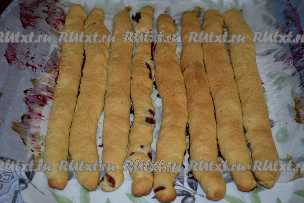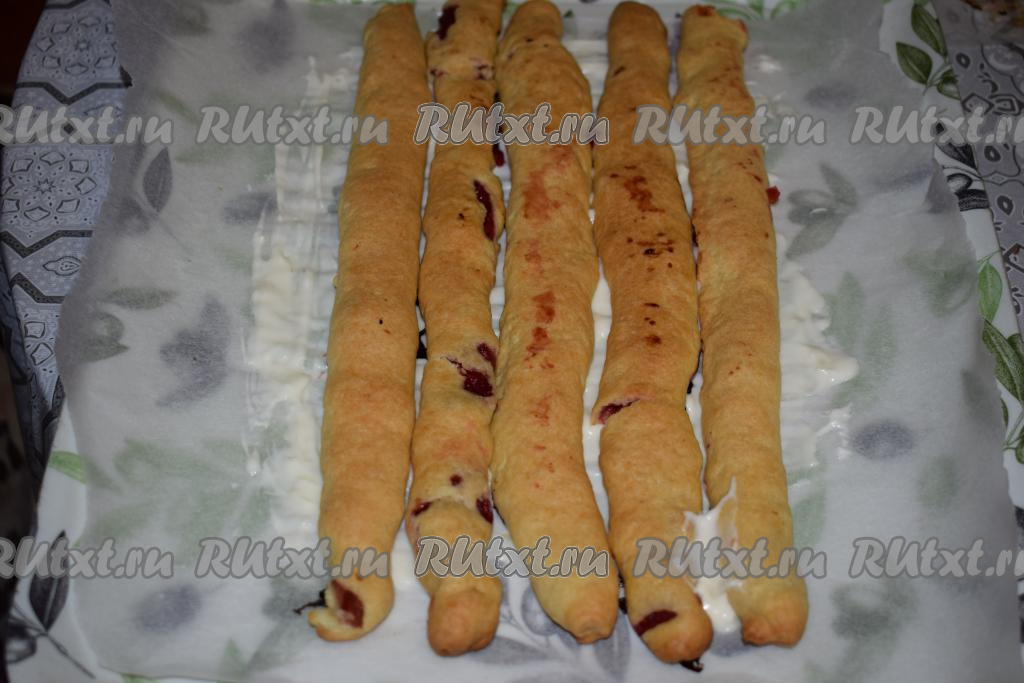 Выкладываем получившиеся трубочки на противень, застеленный пергаментом, соблюдая между трубочками расстояние для того, чтобы они не слиплись друг с другом.