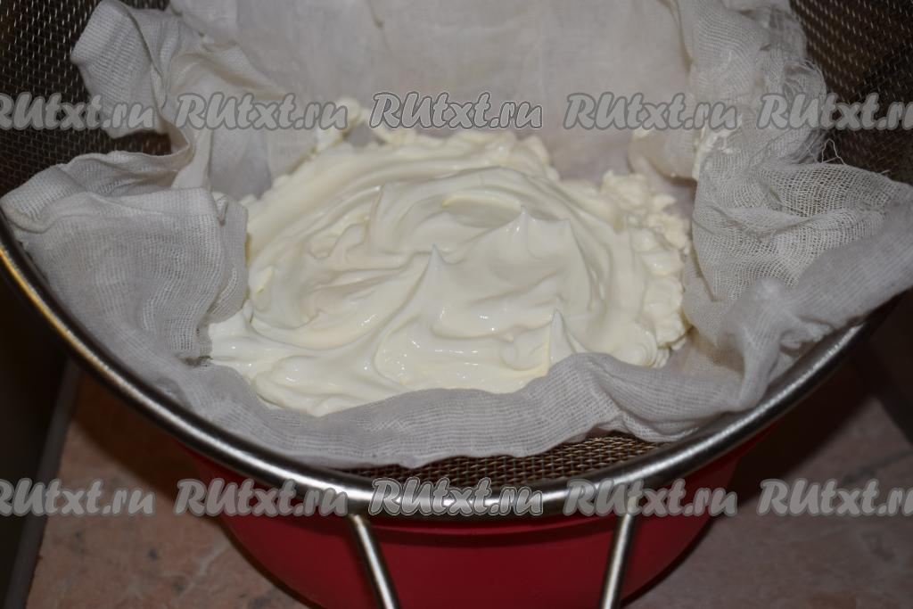 Для начала подготовим сметану для крема, если вы, как и я, используете магазинную сметану, её надо отцедить от жидкости. Для этого ставим чашку, на неё помещаем дуршлаг и застилаем его марлей, сложенной в 2 слоя. Выкладываем сметану на марлю и оставляем стекать на 1,5-2 часа. Для приготовления я использовала 500 грамм магазинной сметаны и 100 грамм домашней жирной.
