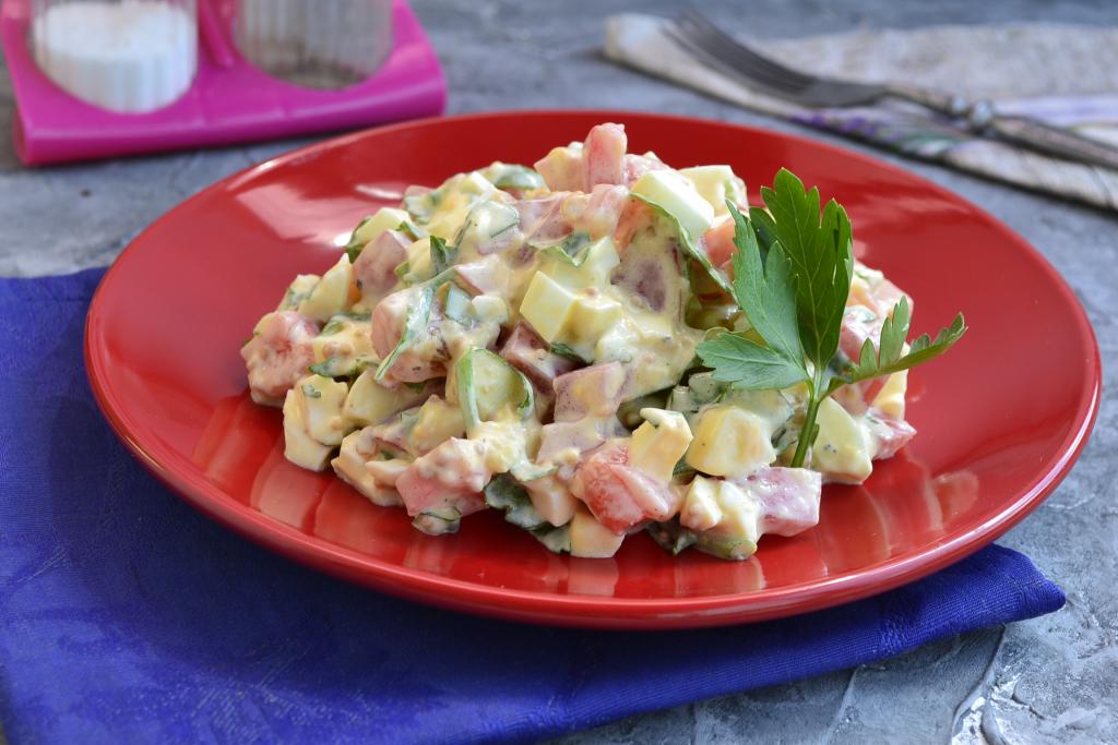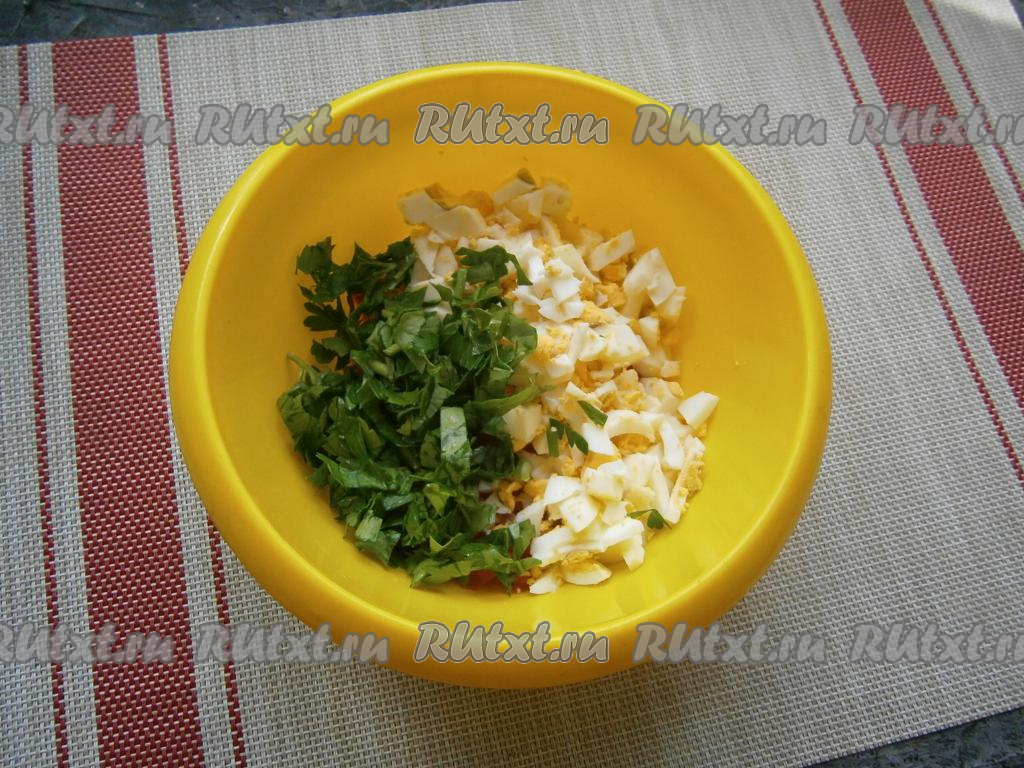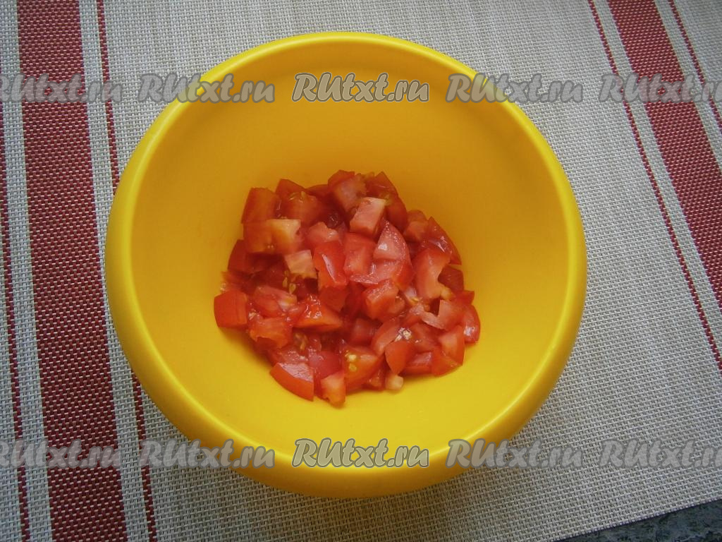Яйца заранее отварить, дав им провариться в закипевшей воде минут 10, затем охладить их и очистить. Спелые, крепкие помидоры нарезать небольшими кубиками.