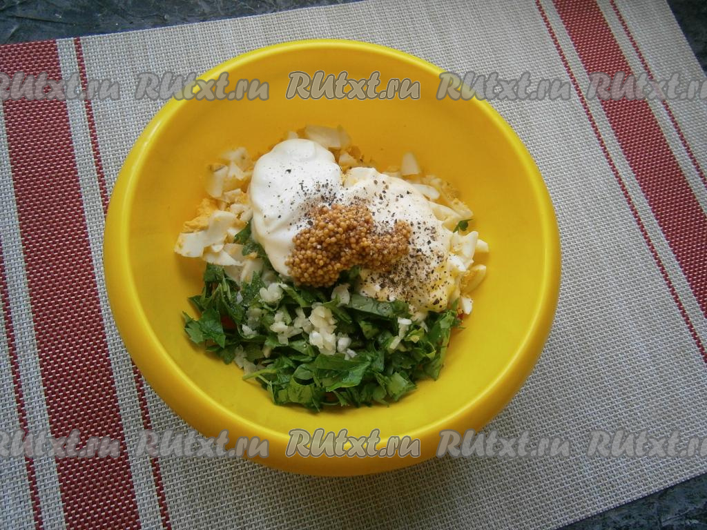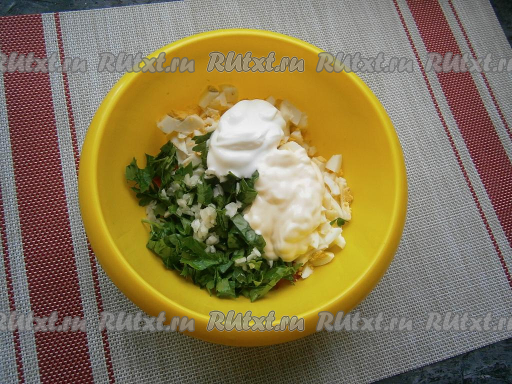 Сюда же добавить майонез и сметану, пропущенный через пресс (или измельчённый ножом) чеснок.