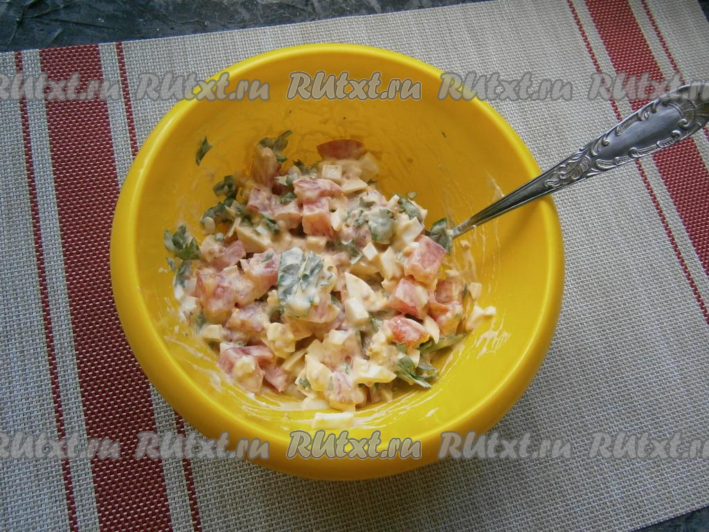 Простой и очень вкусный салат с помидорами, яйцами и чесноком выложить в салатник и можно сразу же подать его к столу!