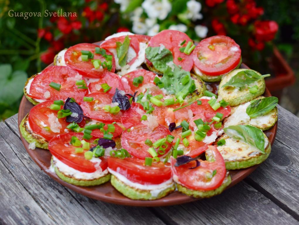 Молодые крепкие кабачки всегда такие аппетитные и вкусные, что хочется готовить их постоянно. Предлагаю разнообразить ваше меню интересной закуской из жареных кабачков с помидорами и чесноком, которая может быть подана как к повседневному, так и к праздничному столу. В сезон свежих овощей затраты на приготовление этого блюда минимальные, а вкус - интересный и пикантный, да и вид очень презентабельный. Сочетание обжаренных кабачков, чесночного соуса, спелых помидоров и ароматного базилика - очень удачное, приготовьте такую закуску и насладитесь её вкусом!