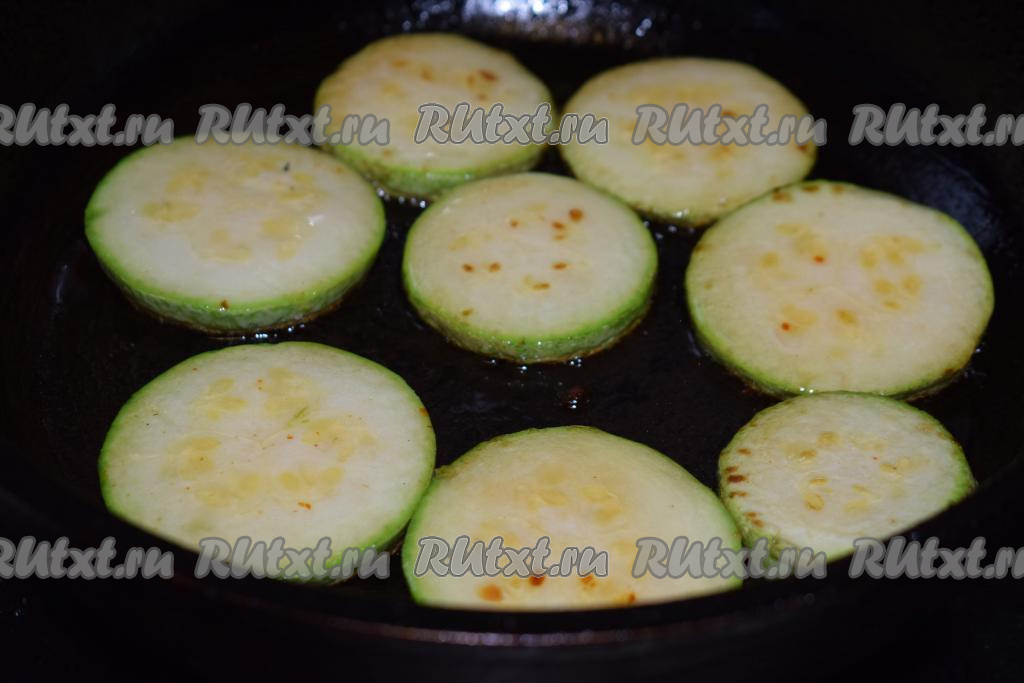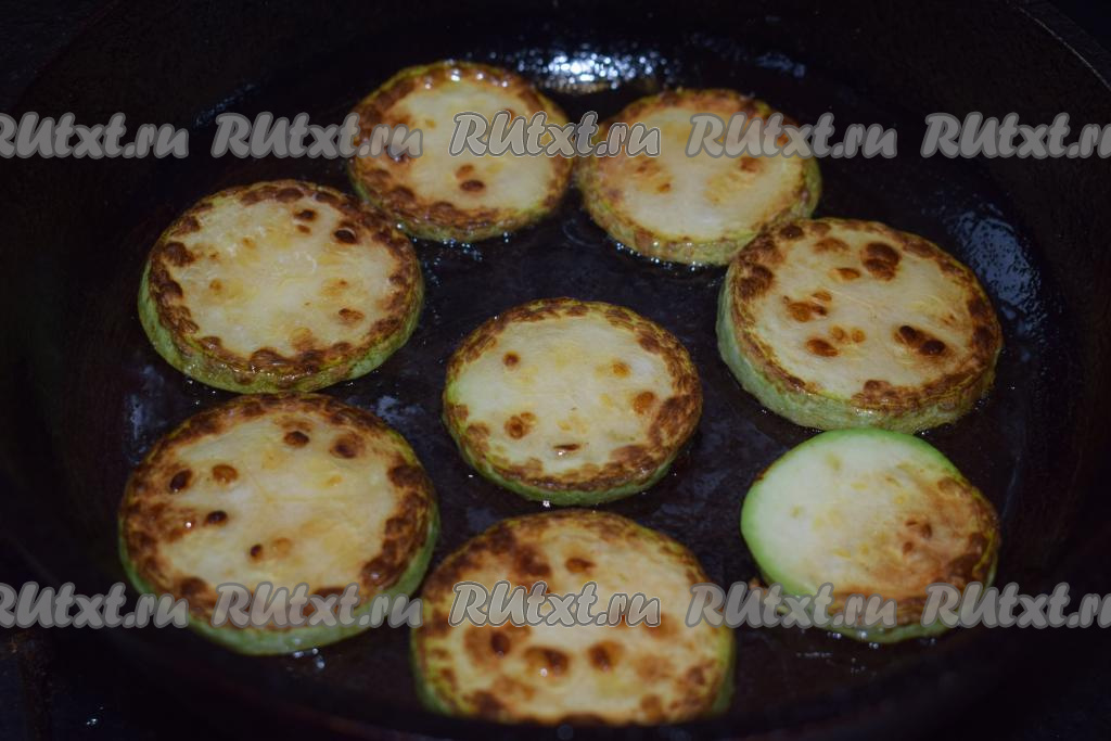 Разогреваем сковороду и вливаем в неё растительное масло. Обжариваем кружочки кабачков на среднем огне, примерно, 6-7 минут с одной стороны.