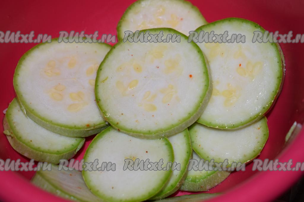 Кабачки с тонкой кожицей можно готовить, не очищая от кожуры. Молодые кабачки нарежем на кружочки толщиной 7-8 мм, выложим в миску, посолим их по вкусу и оставим постоять на минут 10. За это время кабачки просолятся и пустят сок. Сок сливаем и слегка промакиваем кабачки бумажными полотенцами.