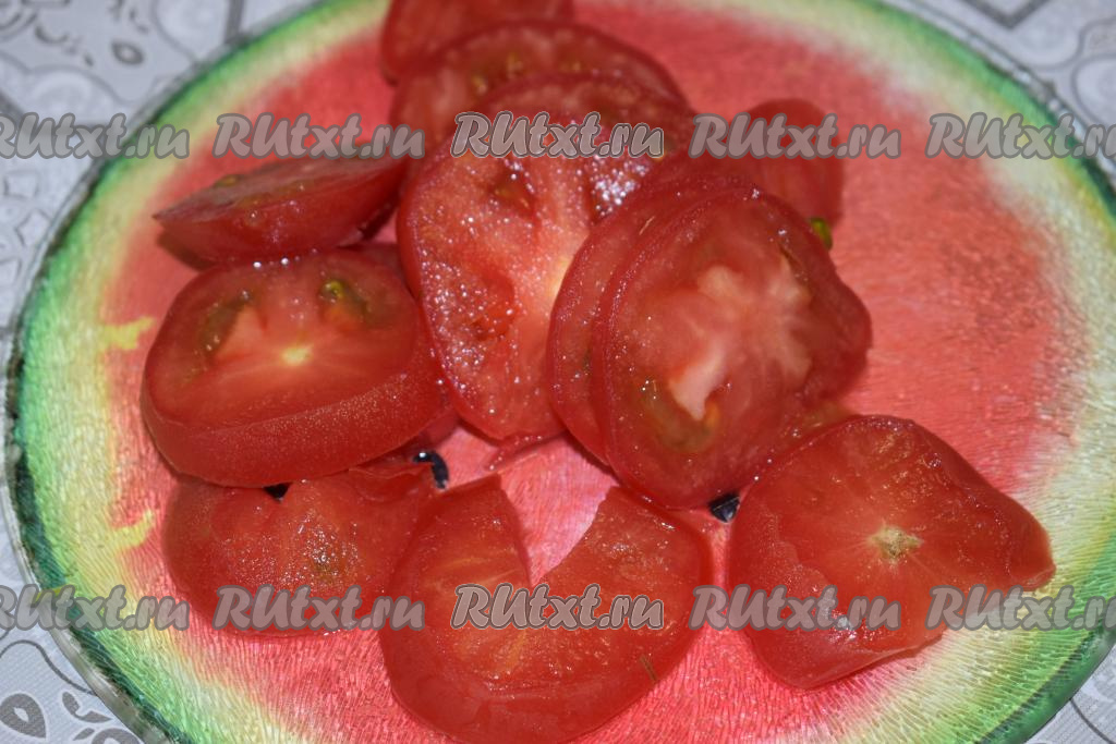 Помидоры нарезаем на кружочки. С веточек базилика обрываем листочки.