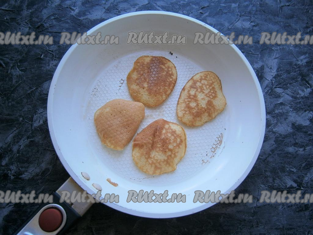 Жарить бисквитные оладьи нужно на небольшом огне до румяности (жарятся достаточно быстро - 1-2 минуты), после чего, с помощью лопатки оладьи перевернуть и жарить ещё 1 минуту. Сковорода должна быть с антипригарным дном.