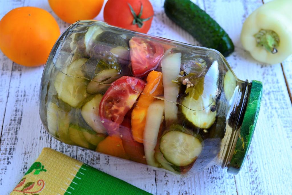 Банку закрутить крышкой (крышку предварительно прокипятить в течение 3-5 минут в воде), перевернуть и укутать до полного остывания, а затем убрать на хранение (заготовка может прекрасно храниться в условиях городской квартиры). Приготовьте овощное ассорти из огурцов, помидоров и болгарского перца по этому рецепту, а зимой насладитесь яркой и вкусной консервацией.
