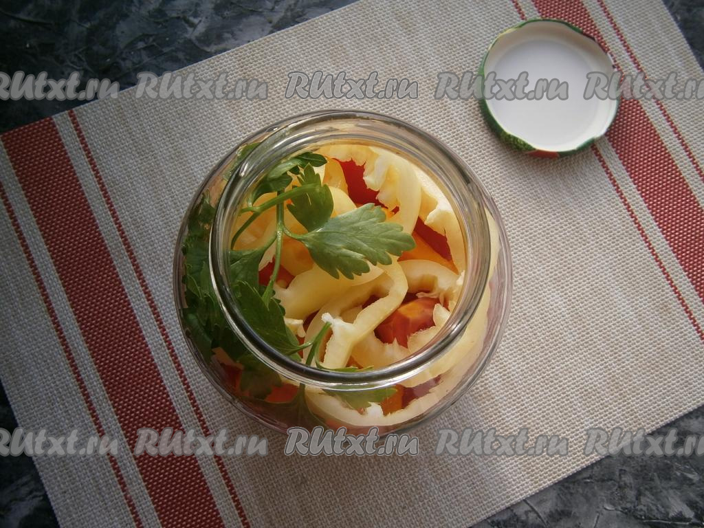 Далее слои перца, огурцов и помидоров повторить, наполняя банку доверху. Овощи нужно укладывать не слишком плотно. Между овощами можно разместить ещё несколько веточек петрушки.